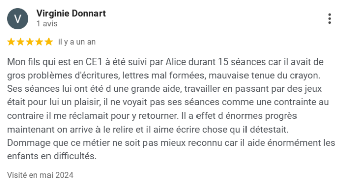 "Mon fils se fatiguait, appuyait trop et n'avait pas une écriture régulière. Avec l'entrée en 6eme ça allait être compliqué. Après plusieurs séances avec Alice son écriture est devenue plus jolie, plus lisible, il y a eu une vraie différence. Aujourd'hui il ne me dit plus qu'il est fatigué d'écrire." Aurore