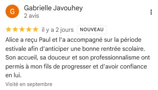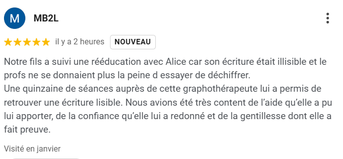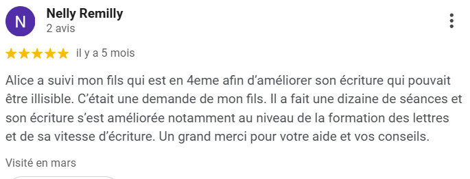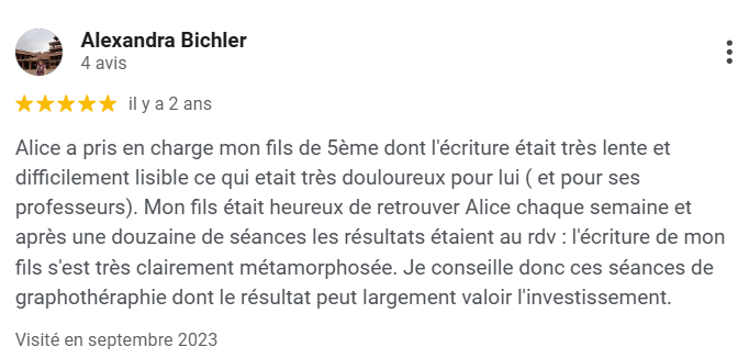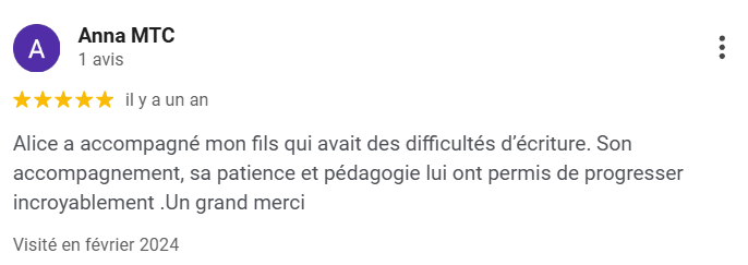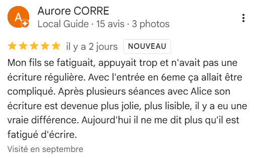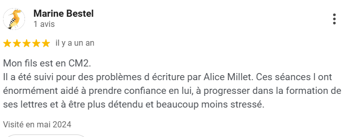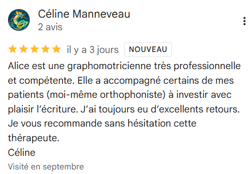 "Alice est une graphomotricienne très professionnelle et compétente. Elle a accompagné certains de mes patients (moi-même orthophoniste) à investir avec plaisir l’écriture. J’ai toujours eu d’excellents retours. Je vous recommande sans hésitation cette thérapeute." Céline